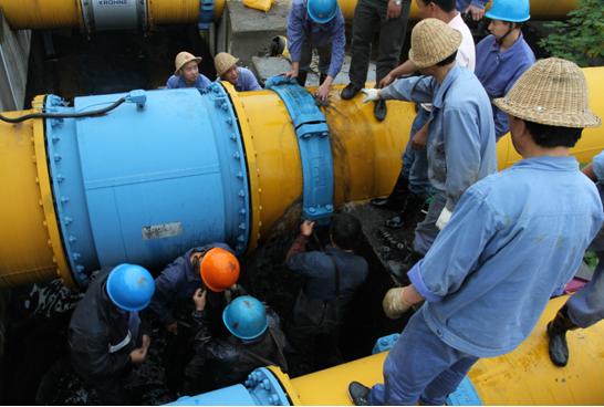 當(dāng)時,工作人員正在現(xiàn)場巡視,實然發(fā)現(xiàn)市排DN800管道流量計后硬性伸縮節(jié)滲漏噴水,于是立即按照報告制度進行匯報,該公司立即啟動應(yīng)急預(yù)案。搶修分兩路展開,一隊人員用應(yīng)急水泵,將滲漏的污水打入生產(chǎn)系統(tǒng)中;另一隊人員對滲漏點進行檢查,確定是因硬性伸縮節(jié)的兩顆螺絲膨脹后崩斷造成爆管。在通知排水公司對進廠流量進行控制的同時,現(xiàn)場搶修指揮人員立即組織維修人員對硬性伸縮節(jié)進行更換。維修人員在采取相關(guān)安全措施后,冒著不斷噴出的污水,立刻進行拆裝螺栓作業(yè)。隨著水流一點點變小,漏點最終被徹底控制。