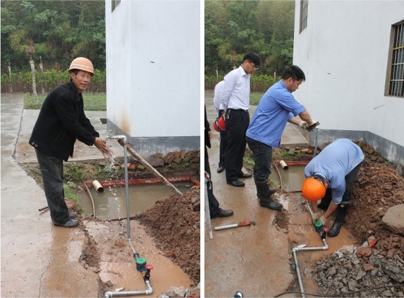 為盡快幫助村民解決用水問題,安裝小組冒雨前往。在安裝現(xiàn)場,我們看到有人在使用套絲機,有人在接水管,大伙忙的不亦樂乎。經(jīng)過2個小時的奮戰(zhàn),順利為其接通水源,安好水表,并裝好了水龍頭。當現(xiàn)場看到水龍頭流出水的那瞬間,大家的心情都非常激動,費某的臉上更露出了久違的笑容,欣喜的用手接起了新家的“第一股清泉”。