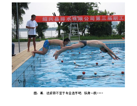 上午舉行第三屆職工游泳比賽,公司在柯橋南岸公園舉行第三屆職工游泳比賽。本次比賽項目分為男子個人50米、女子個人25米,此項水上運動公司已連續舉辦三年,深受職工歡迎,有近40名職工參加。比賽緊張有序,現場氣氛活躍,精彩場面不斷,加油聲不絕于耳。